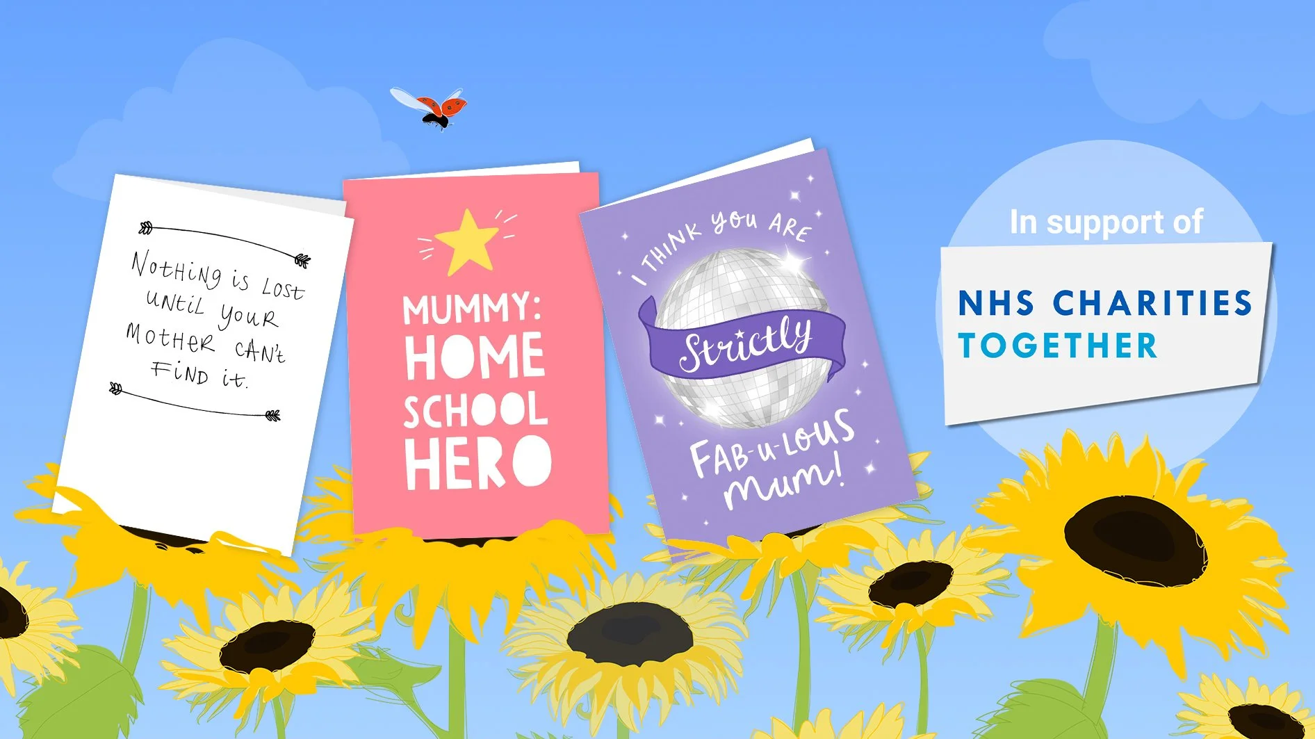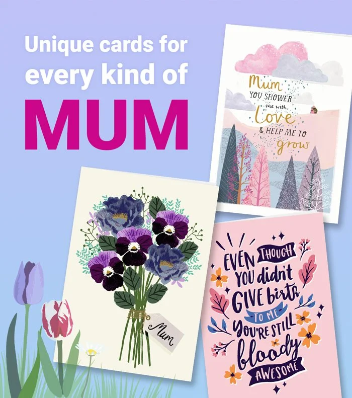 Promoted “Cards for Every Kind of Mum” with segmented hero images tailored to audience groups (humorous, heartfelt, or child-led).