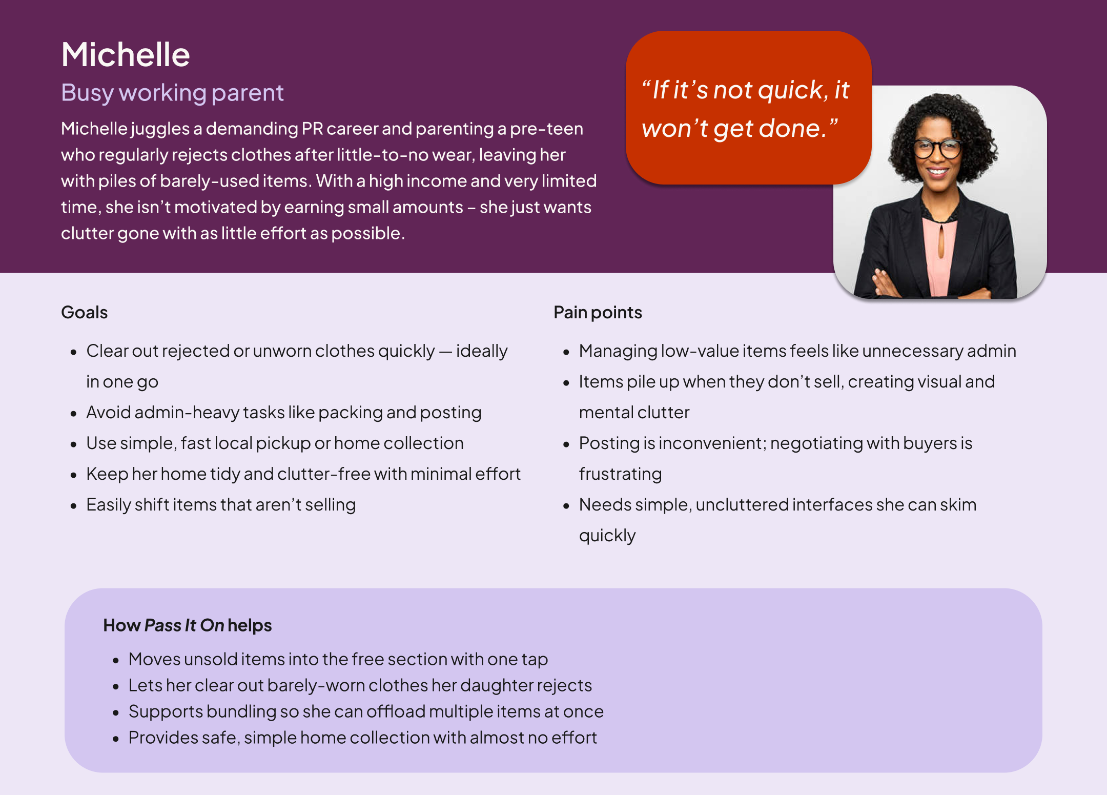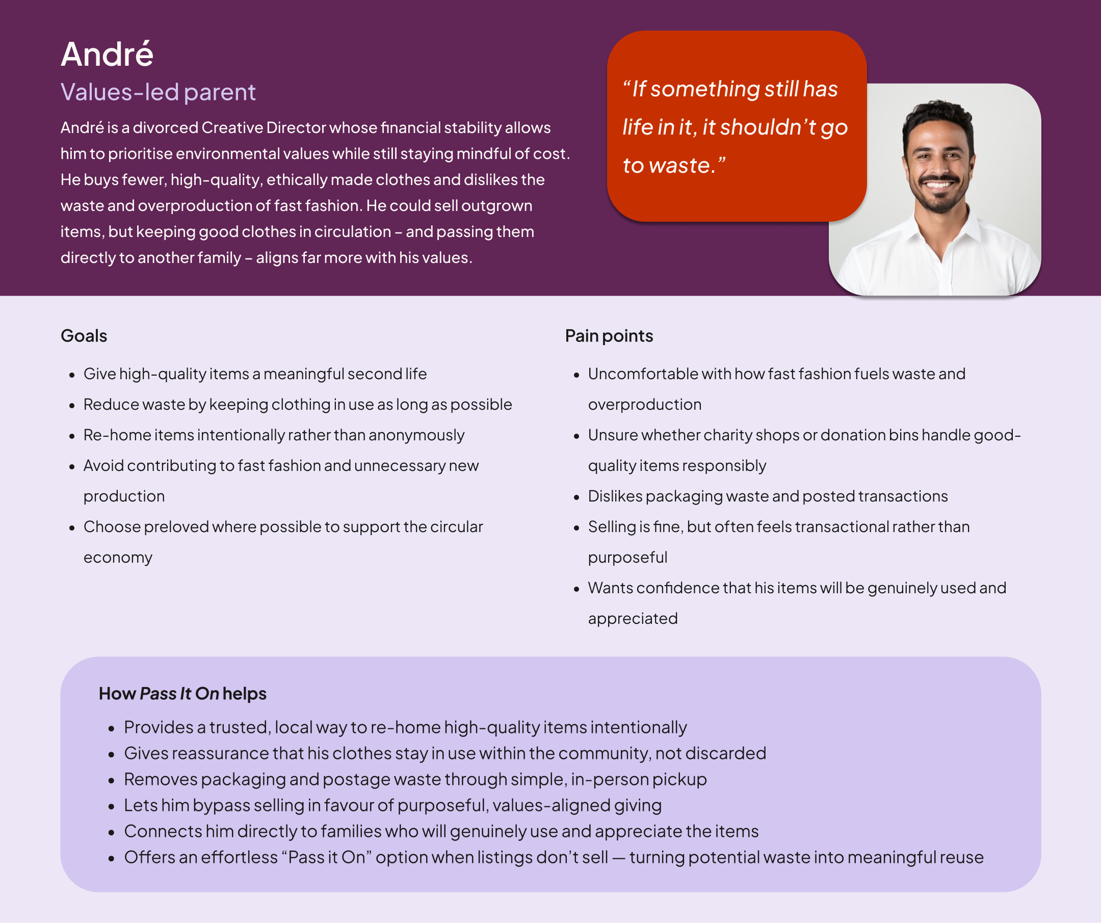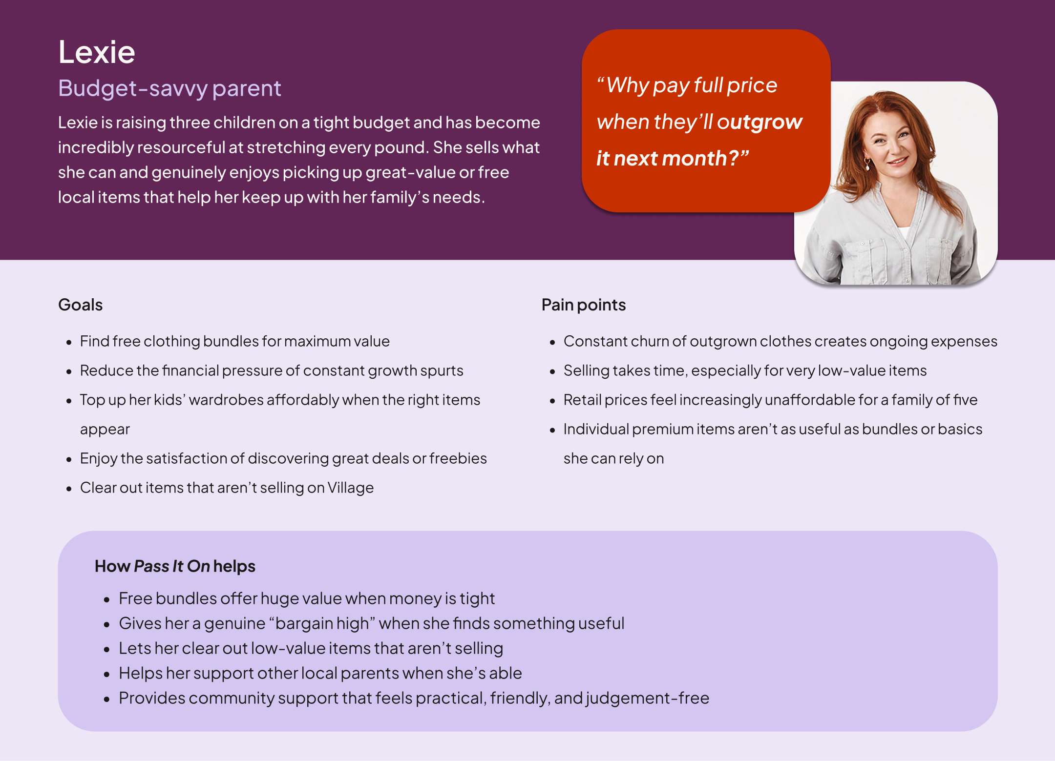 Because Pass It On is a feature extension rather than a new product, I began by revisiting Village’s existing personas. I refreshed and reframed them through the lens of freegiving and the circular economy to understand how each user might engage with a new non-commerce mode.