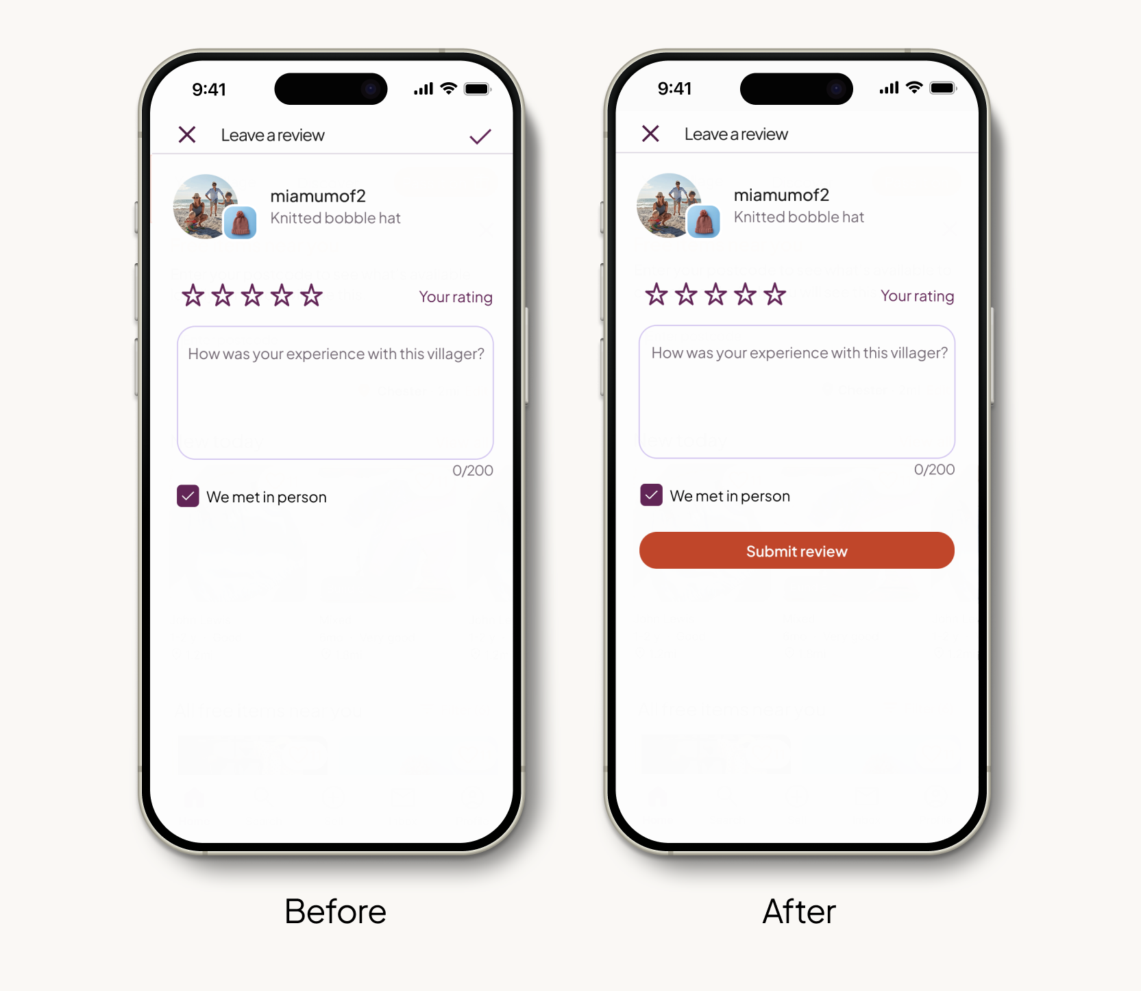 Lightweight trust signals: The review flow is deliberately familiar—using star ratings and optional text—but includes a "We met in person" checkbox. This allows the system to distinguish high-value community interactions from standard transactions without increasing cognitive load.