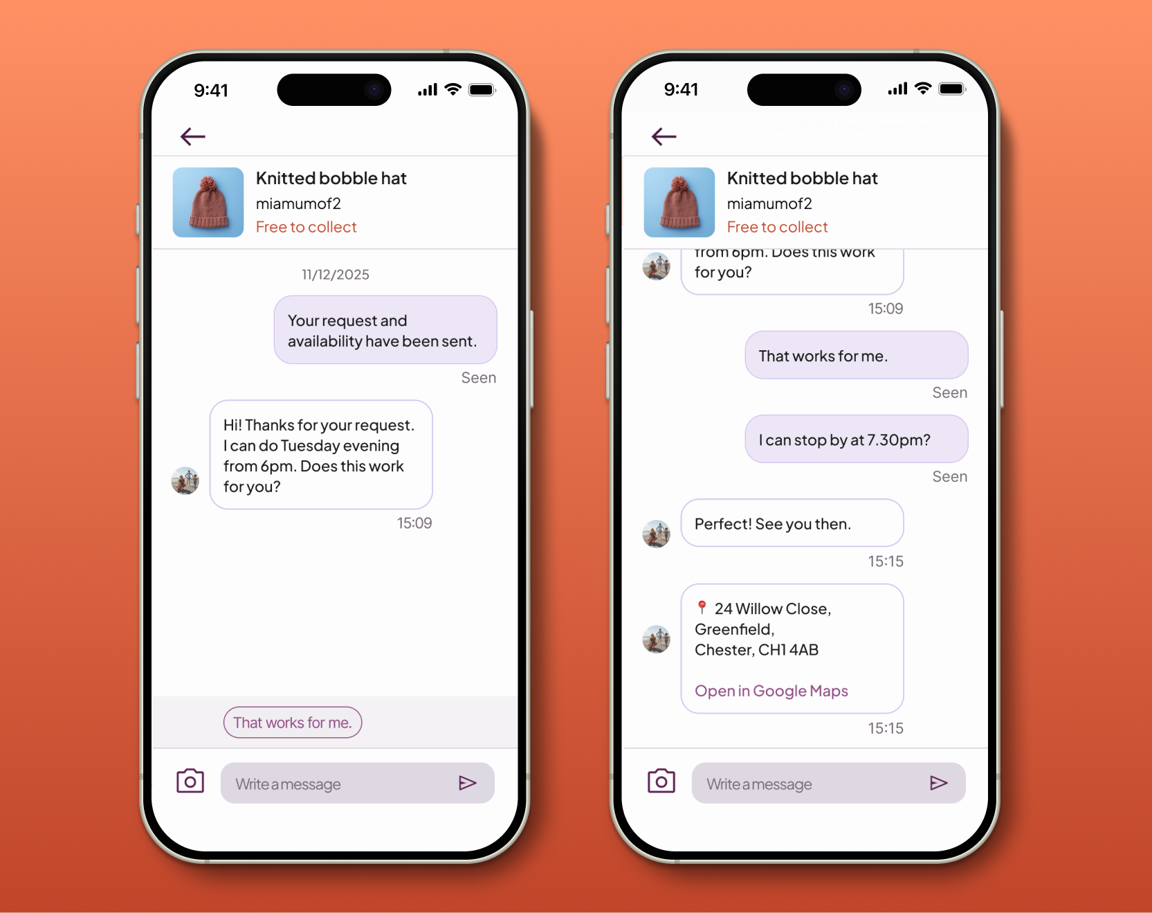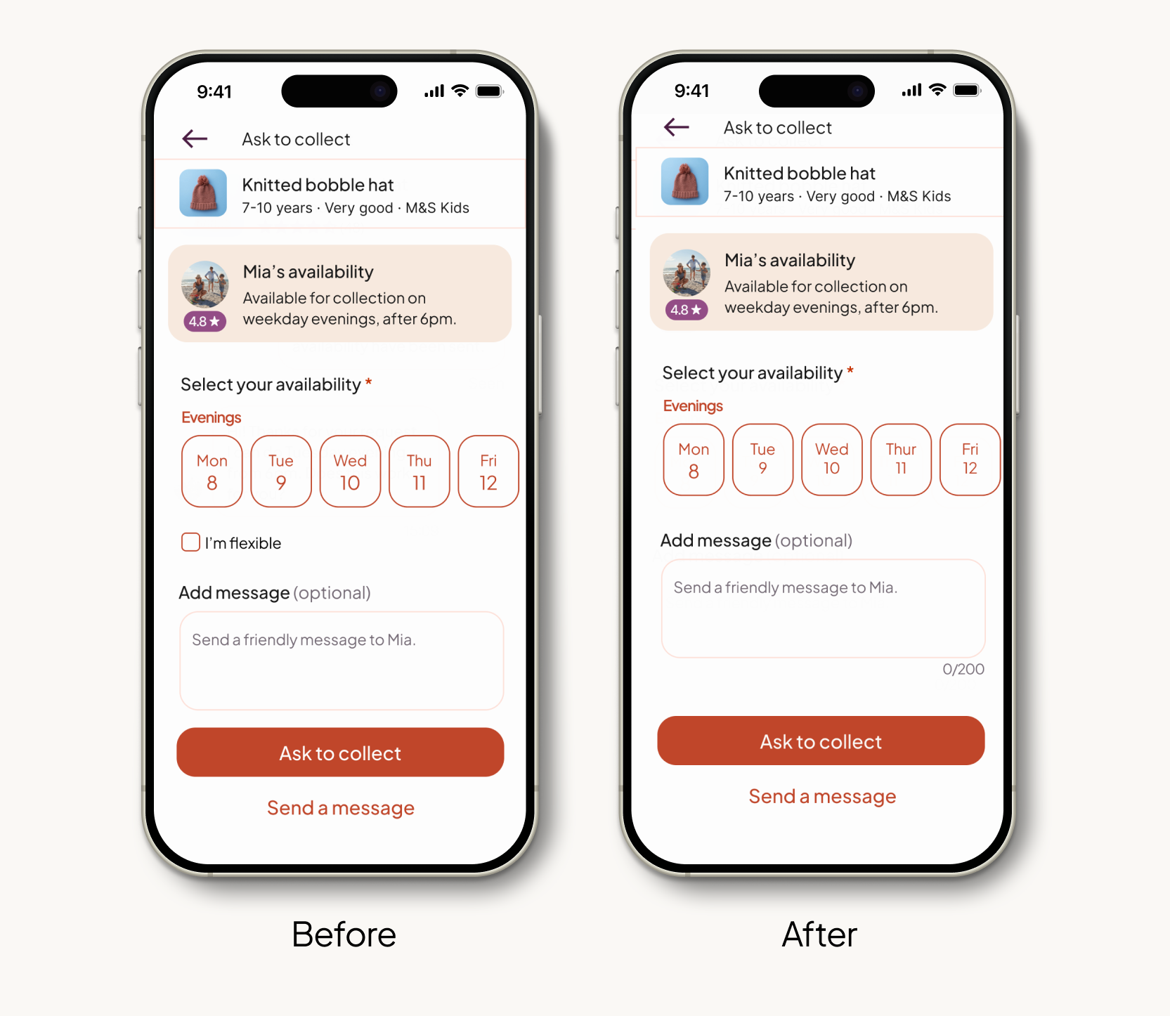 The "flexi-window": Collectors select from the lister's availability windows (e.g. weekday evenings) directly within the request. Defining collection windows at the point of request sets clear expectations early on, bypassing the mental load of manual back-and-forth messaging.