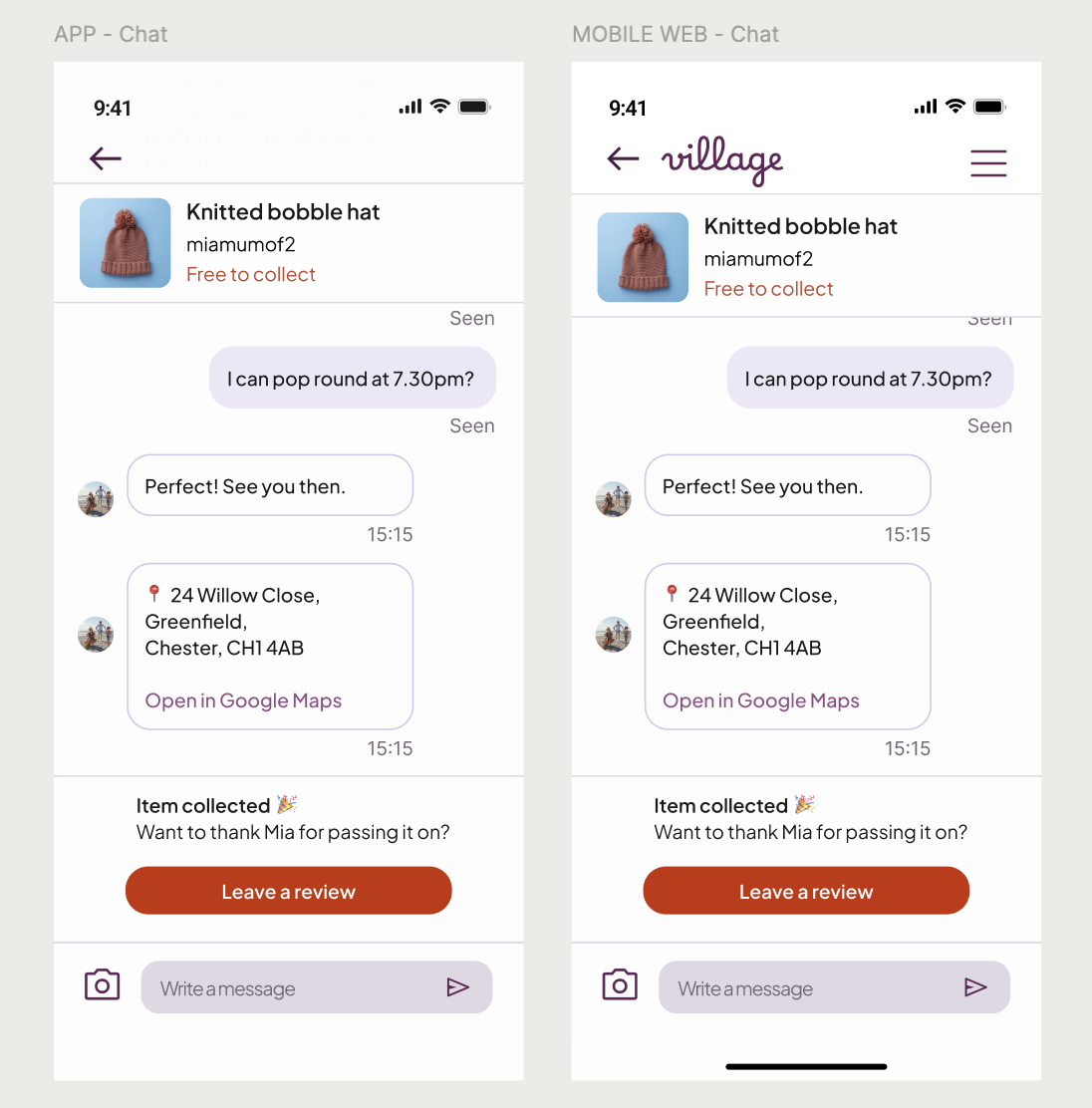 Design note: The UI returns to the primary Village Purple to reinforce that chat is a global, trusted surface within the app rather than a Pass It On–specific flow. A subtle “Free to collect” tag in the PIO accent colour preserves transaction context without disrupting the familiar messaging experience.