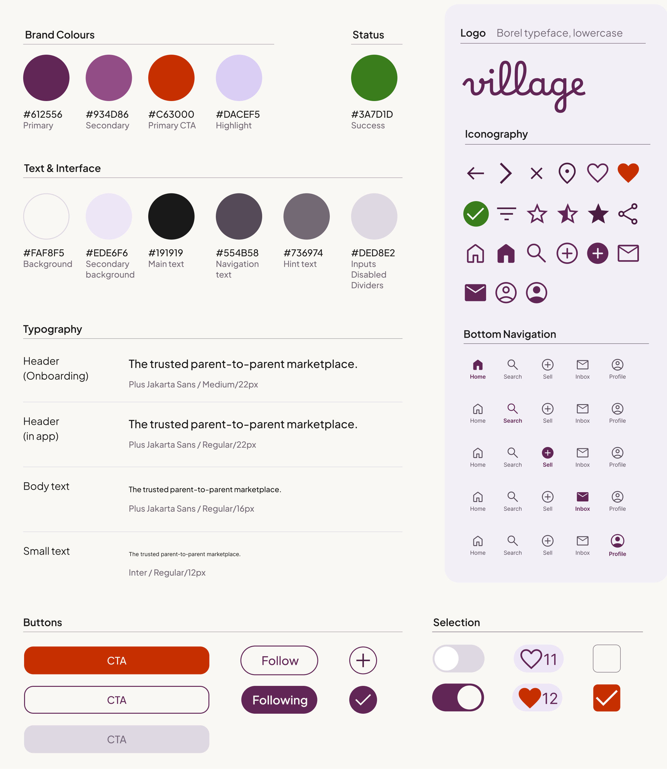 From here, I centred the design on personalisation and trust & community. Earlier research revealed parents describing the strain of “not having a village” – lacking support systems and hand-me-downs. Combined with a competitor audit showing a gap for a more human, personalised approach, this inspired both the name Village and the idea of a parent-to-parent marketplace.