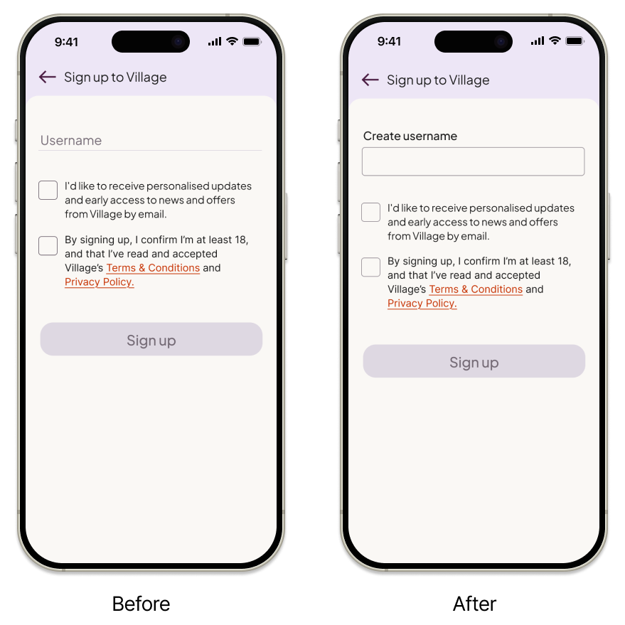 Design Update: Replaced the faint line with a clearly defined input box and bolder title (“Create username”), making it instantly recognisable and ensuring users complete the step smoothly..