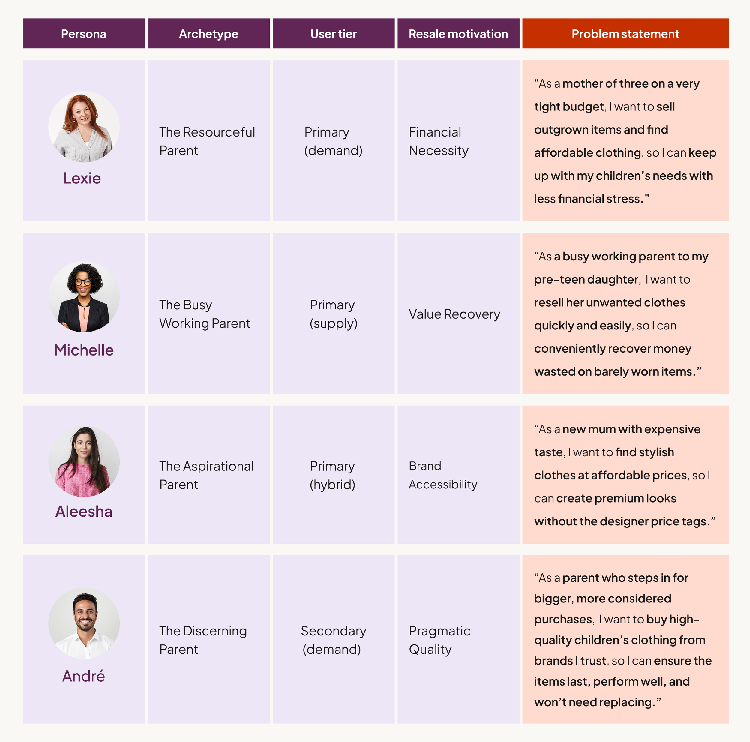 While research confirmed that mothers remain the primary demographic, I defined four archetypes to ensure the experience met a diverse range of resale motivations. Moving beyond basic demographics, these personas represent a spectrum of reasons for choosing second-hand: financial necessity (Lexie), aspirational brand accessibility (Aleesha), value recovery (Michelle), and my secondary user, pragmatic quality (André).
