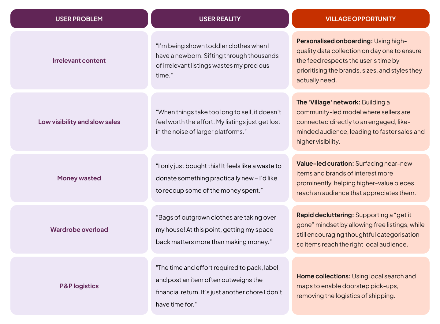 I distilled my research into five primary pain points that defined the requirements for Village: